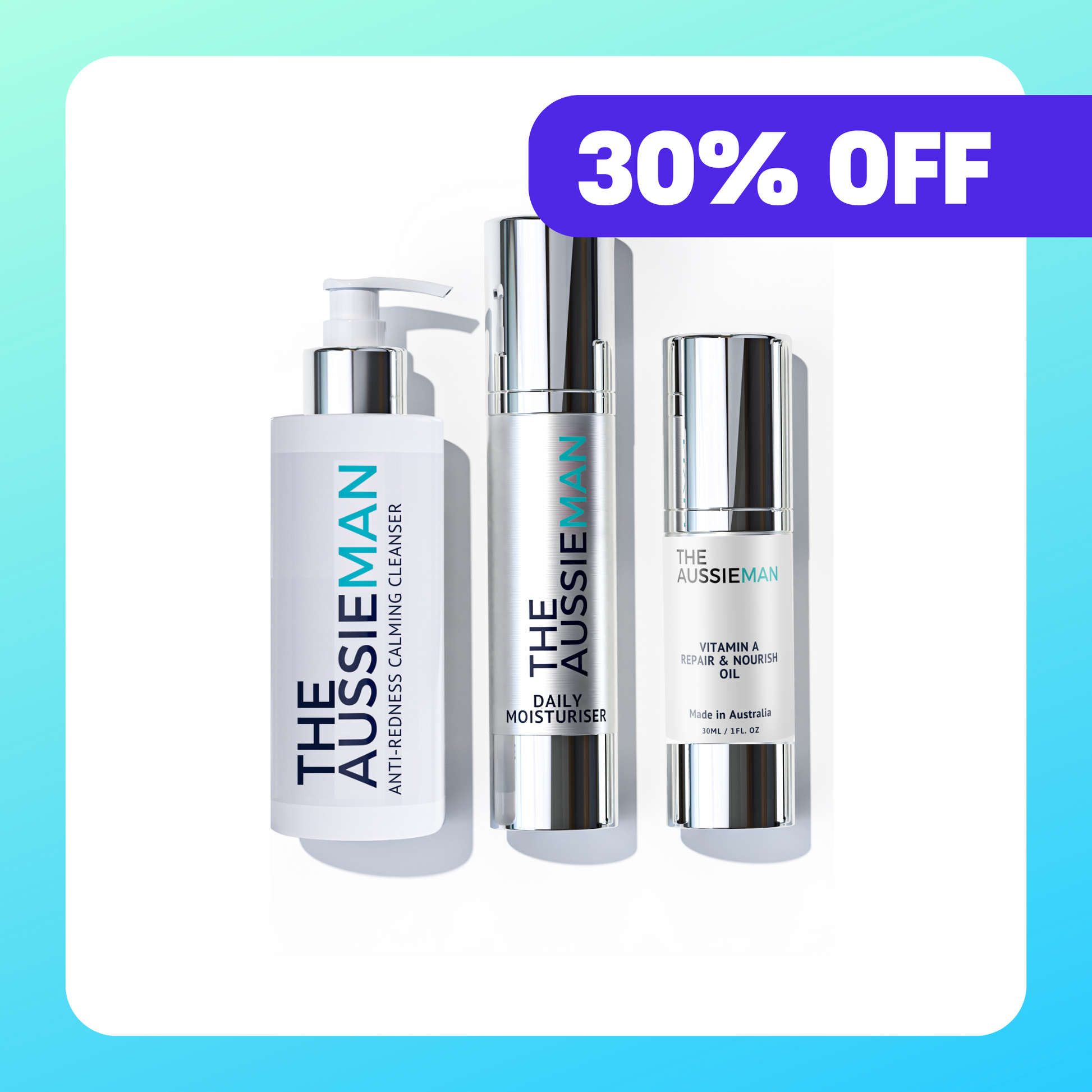 Introducing The Aussie Man's Anti-Redness Skincare Bundle, your all-in-one solution for calming redness, soothing irritation, and restoring a healthy, balanced complexion. This bundle is meticulously designed for men who battle redness and rosacea, using natural, high-performance ingredients that deliver visible results without harsh chemicals.